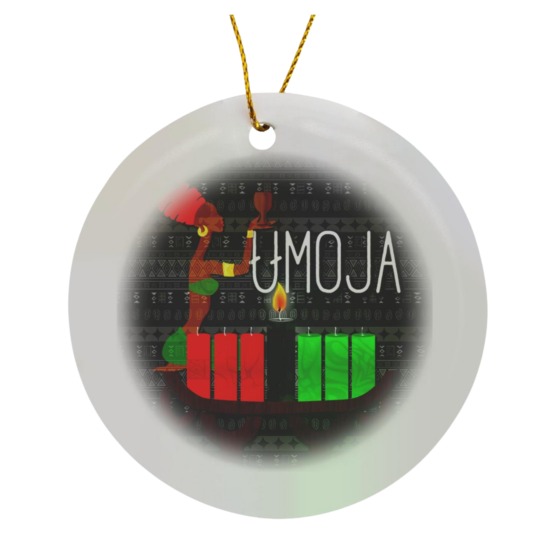 This ornament is more than decoration—it's a tribute to Umoja, the foundation of Kwanzaa. At its heart glows the kinara, with its vibrant red, black, and green candles representing struggle, identity, and hope. Flanked by ancestral dancers and patterns of the diaspora, this piece calls us home—to ourselves, to each other, and to a shared legacy that cannot be erased.