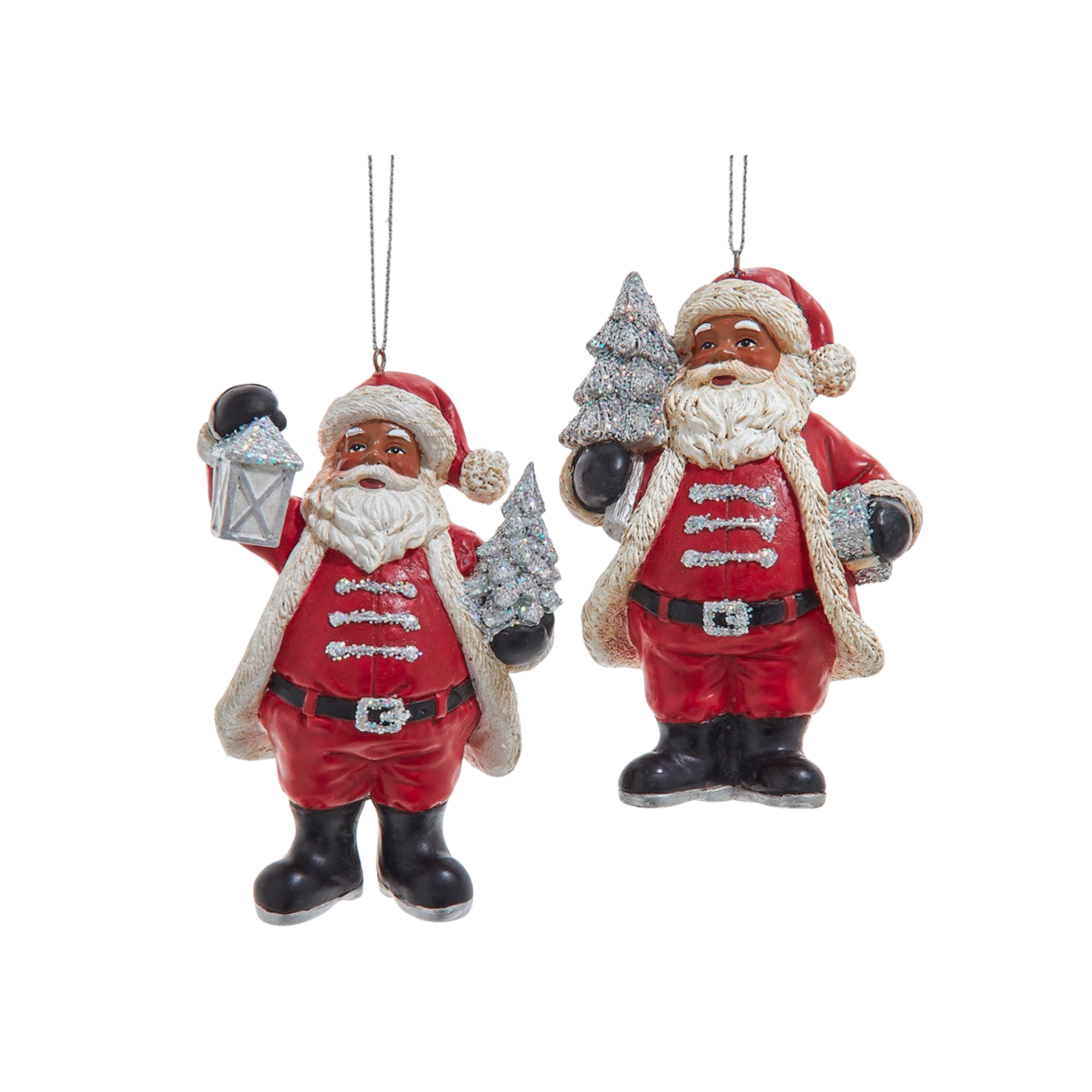 Bring a joyful soul to your holiday décor with this beautifully detailed set of African American Santa ornaments. Dressed in classic red and trimmed in festive glitter, each Santa carries a silver tree or lantern, ready to light up your Christmas tree with heritage and heart.