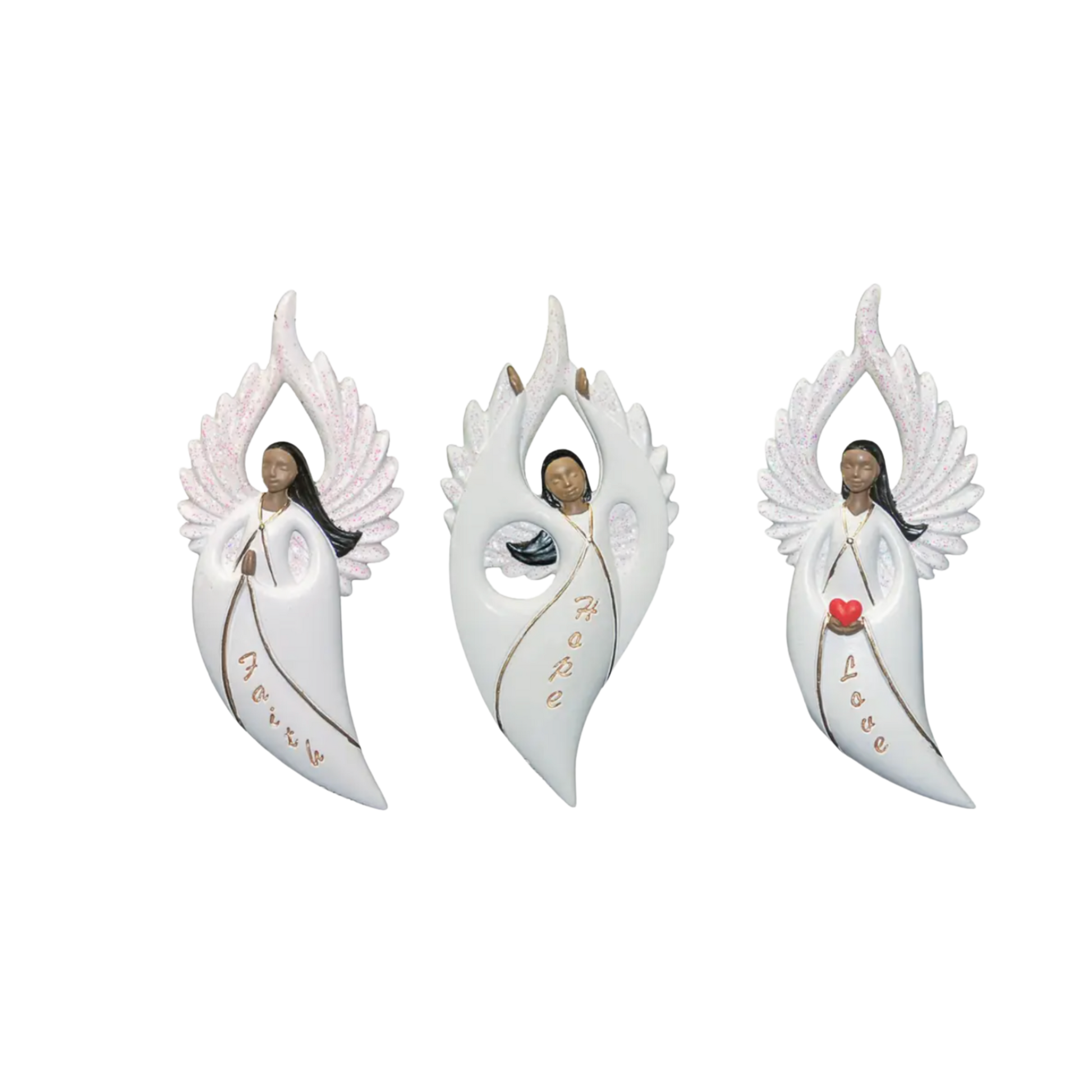 Infuse your holiday with elegance and intention. This stunning trio of flat-style angel ornaments is cloaked in soft white with shimmering wings and radiant gold script. Each ornament represents a core virtue — Faith, Hope, and Love — making them a meaningful gift or timeless keepsake for your own tree.