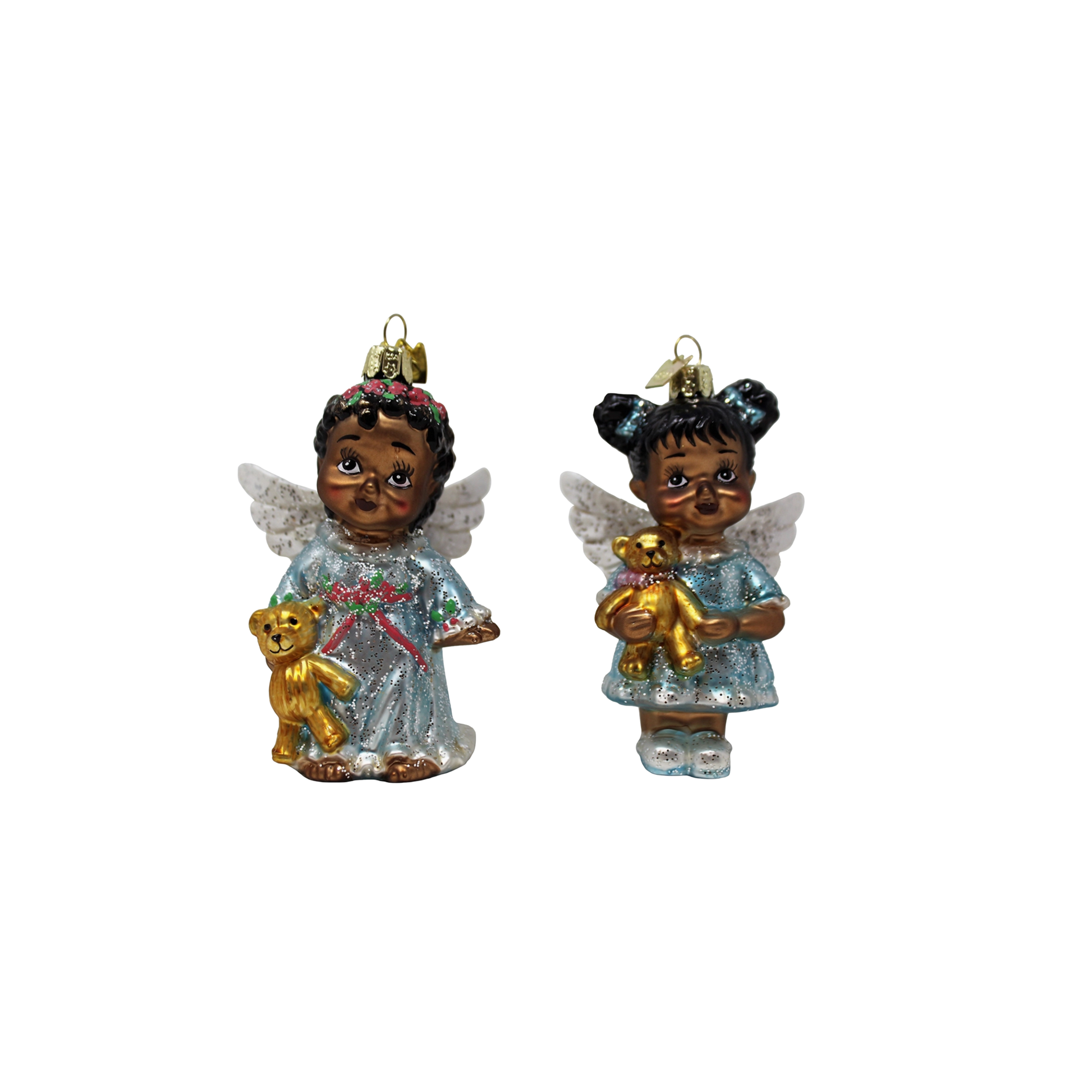 Bring sweetness and sparkle to your holiday decor with the Noble Gems Black Angel Ornament Set by Kurt Adler. This delightful duo features two beautifully hand-painted 4" glass ornaments — each adorned in shimmering icy blue with delicate glittered wings and golden teddy bears in hand. Perfect for collectors, Christmas trees, or gifting, these angels radiate love, innocence, and holiday joy through every curl and halo.