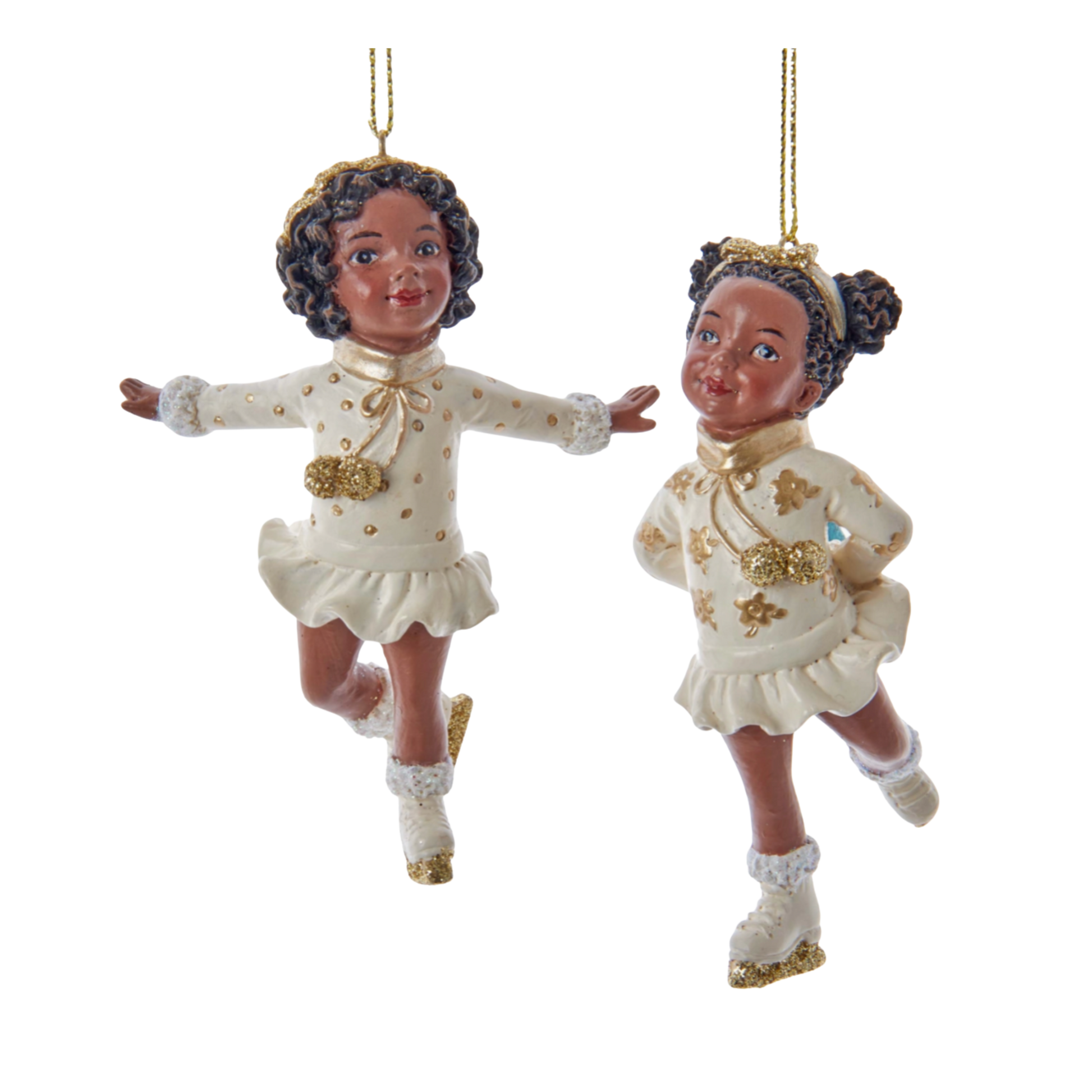 Add sparkle and motion to your winter décor with these African American skating girl ornaments. Dressed in ivory and gold with faux fur trim and glittering accents, these two joyful figures glide with grace and holiday cheer.