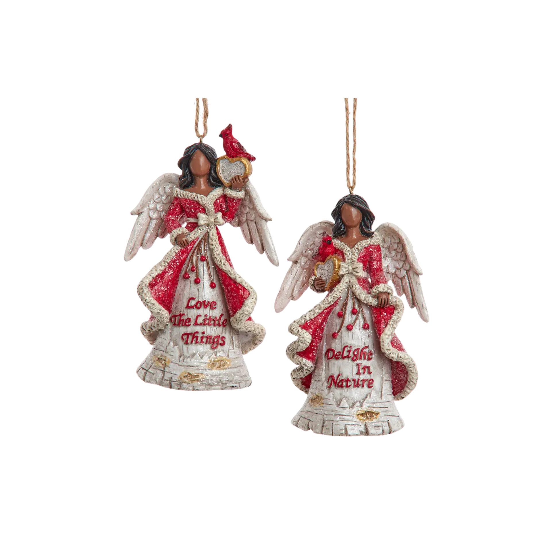 Celebrate the warmth of the season with these beautifully detailed Mahogany Angel ornaments. This set features two serene angels in flowing red and white gowns, each with shimmering wings and natural hairstyles. One angel holds a bright red cardinal and a heart that reads “Love the Little Things,” while the other reads “Delight in Nature.” These ornaments bring love, beauty, and intention to your tree or holiday décor.