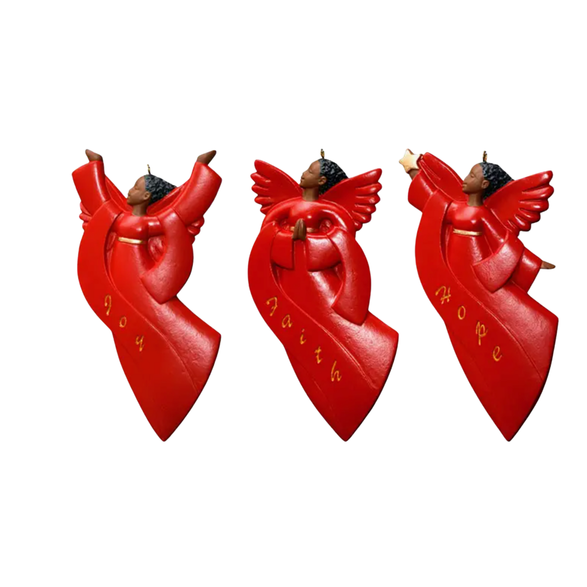 This trio of radiant red Black angel ornaments embodies the energy of Joy, the grounding of Faith, and the promise of Hope. Whether you're trimming your tree or gifting encouragement, these graceful figures serve as a reminder of the light we carry.